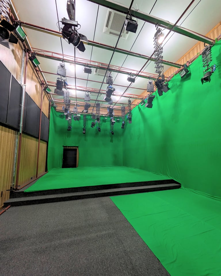 This combination of world-class acoustic treatment and massive green screen installation ensures a professional, flexible, and reverb-free environment suitable for a wide variety of multimedia applications.